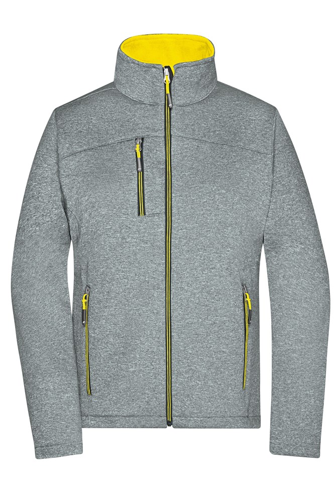 Angenehmes, weiches 2-Lagen Softshellmaterial Fleece-Innenseite in Kontrastfarbe Durchgehend hinterlegter Frontreißverschluss mit Kinnschutz Stehkragen 2 seitliche Taschen und eine Brusttasche mit Reißverschluss JN1147: leicht tailliert 1/2 Oberweite: 47 cm 1/2 Taillenweite: 42 cm 1/2 Saumweite: 49 cm Länge ab Schulter Vorderteil: 61 cm Länge ab Schulter Rückenteil: 63 cm Ärmel Länge: 60 cm OEKO-TEX® Standard 100 (15.0.70467) Softshell 2-lagig bonded Brusttasche Stehkragen