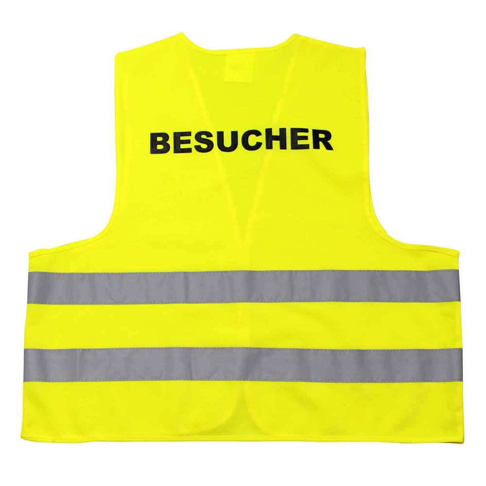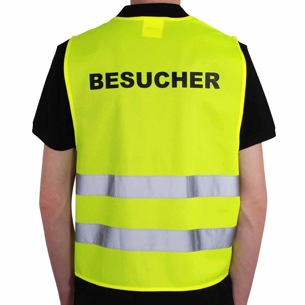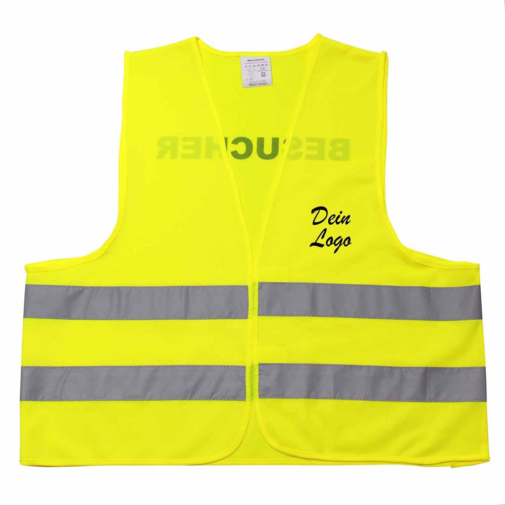 Unsere Warnweste Premium gelb ist aus 100% Polyester, wird nach EN ISO 20471 produziert und ist TÜV-Rheinland geprüft. Mit Anleitung einzeln im wiederverschließbaren Polybeutel verpackt. Durch die beiden Klettverschlüsse ist die Größe variabel einstellbar. Mit zwei reflektierenden Streifen, perfekt vernähte Qualität und Einleger in sieben Sprachen mit den gesetzlichen Pflichtangaben. Mit dem Standardmotiv 'Besucher' auf der Rückseite 1farbig schwarz bedruckt. Ein zusätzlicher Druck auf der Vorderseite ist möglich. Gern erstellen wir Ihnen dazu ein Angebot.
