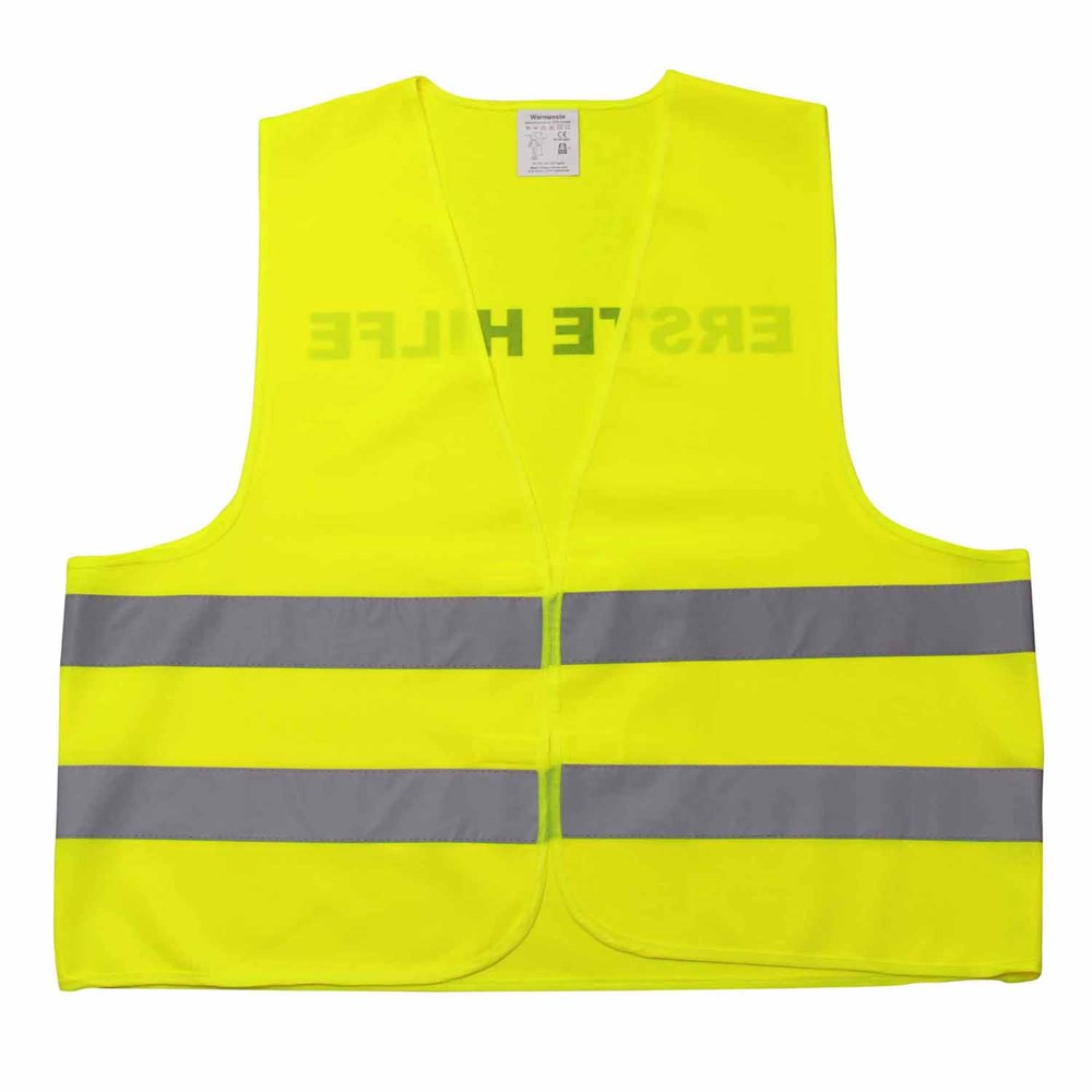 Unsere Warnweste Premium gelb ist aus 100% Polyester, wird nach EN ISO 20471 produziert und ist TÜV-Rheinland geprüft. Mit Anleitung einzeln im wiederverschließbaren Polybeutel verpackt. Durch die beiden Klettverschlüsse ist die Größe variabel einstellbar. Mit zwei reflektierenden Streifen, perfekt vernähte Qualität und Einleger in sieben Sprachen mit den gesetzlichen Pflichtangaben. Mit dem Standardmotiv 'Erste Hilfe' auf der Rückseite 1farbig schwarz bedruckt. Ein zusätzlicher Druck auf der Vorderseite ist möglich. Gern erstellen wir Ihnen dazu ein Angebot.