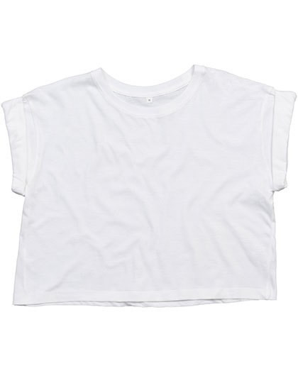Lockeres, bauchfreies Rundhals T-Shirt | Bio-Baumwolle, ringgesponnen und gekämmt | Fallende Schulterpartie mit aufgerollten Ärmeln | Saum mit Zwillingsnadel | 1x1 Ripp-Kragen | Abreißbares Größenetikett
