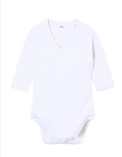 Bio-Baumwolle, ringgesponnen und gekämmt | Interlock | Body im Kimono-Wrapover-Stil | Nickelfreie Druckknöpfe an den Beinen für leichtes An- und Ausziehen | Nickelfreie Druckknöpfe an der Beinöffnung | Einfassung am Hals, an den Ärmelenden und Beinöffnungen für mehr Formbeständigkeit | Lange Raglan-Ärmel | Abreißbares Größenetikett | Pflegeetikett mit QR-Code zur Rückverfolgung der Lieferkette und Prüfung der positiven Auswirkungen des Kaufs von Biomaterialien | Pflegeetikett aus Bio-Baumwolle