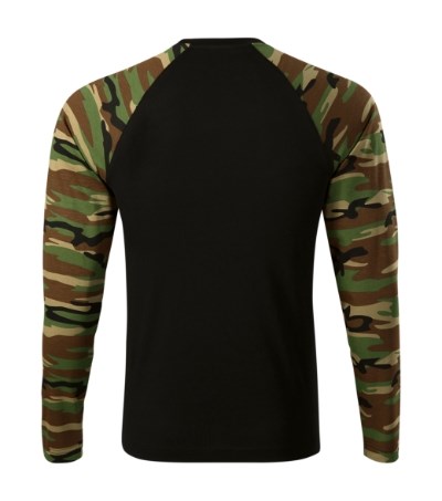 Schnitt mit Seitennähten, schmal geformter Kragensaum aus 1:1 Rippstrick mit 5 % Elastanzugabe, Innenseite des Kragens durch ein gewebtes Band in der Farbe 01 versäubert, lange Raglanärmel in Camouflage-Farbe