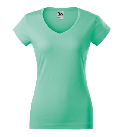 leicht taillierter Schnitt mit Seitennähten, vertiefter V-Ausschnitt, schmal geformter Kragensaum aus Materialfarbe mit 5 % Elastanzugabe, Innenseite des Kragens durch ein Band in T-Shirt Material versäubert, Schulternähte verstärkt mit einem Band, Ärmel der kürzeren Länge, Silikonbearbeitung