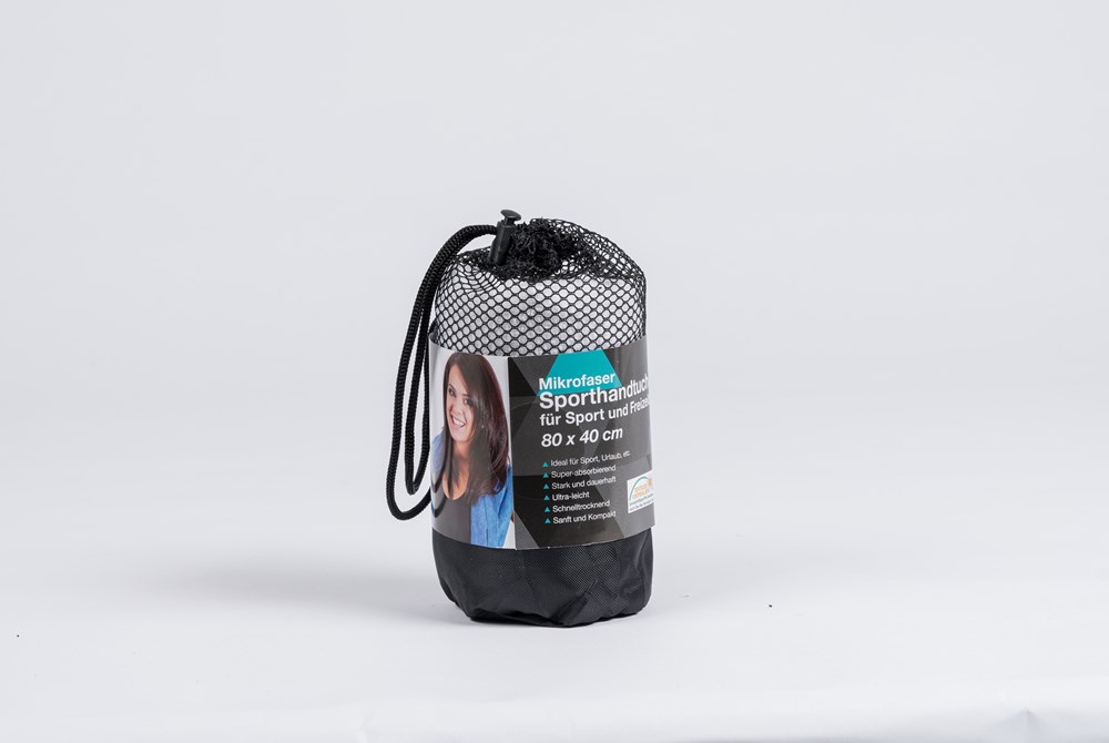 Kleines Sporthandtuch 40x80cm aus 85% Polyester und 15% Polyamid (Mikrofaser-Frottee 280 g/m²), verpackt in einem schwarzen Netzbeutel mit Infobanderole, die auf Wunsch selbst gestaltet werden kann.