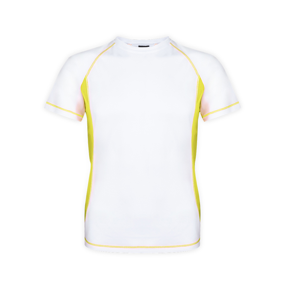 Funktions-T-Shirt für Erwachsene aus 100% atmungsaktivem Polyester (135 g/m2). Design in Weiß mit Verstärkungsnähten und Seiten in kräftigen Farben. Erhältlich in den Größen S, M, L, XL und XXL.